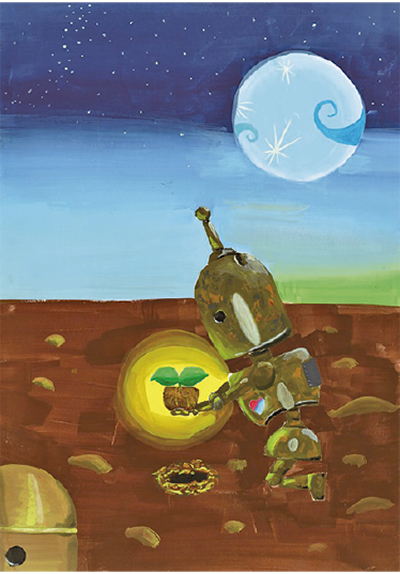 野村さんの作品名は「緑が増えれば」。荒涼とした大地にロボットが木の苗を植えるイメージを幻想的に描いている。武井さんの作品名は「やどり木」で、青々と葉を茂らせる大木にクマやシカ、小鳥やウサギなどの動物が集っているデザインだ。