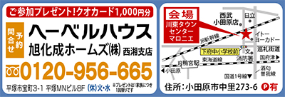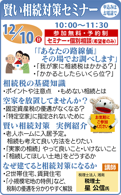 セミナーでは税理士が我が家の路線価をその場で調べ、相続税についてアドバイスしてくれる。また「子どもが独立して夫婦2人では広すぎる自宅」など、身近な実例を取り上げ相続の対策を多数紹介。さらに賃貸住宅等を建てると相続税や固定資産税が大幅に軽減される仕組みも説明する。役立つ情報が満載なので、ぜひ参加を。※当日参加できない人にはセミナー資料を後日進呈(電話で申込みを)。