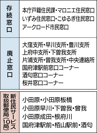 廃止予定の11カ所のうち支所は7つ(大窪・早川・豊川・上府中・下曽我・片浦・曽我)。その中で5支所は築60年以上だ。利用状況は、証明書交付など住民窓口業務の取り扱い約65万件(16年度)の約8割を、存続予定の5カ所(本庁戸籍住民課・マロニエ・いずみ・こゆるぎ・アークロード)が占めている。