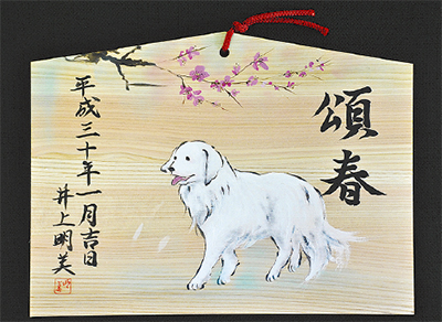 「伝統的行事を通して恵まれない人への愛の募金を」と、入札方式で行われている絵馬展。37回目の今回は、俳優の伊東四朗さんや歌手の五木ひろしさん、由紀さおりさん、五輪金メダリストの古賀稔彦さん、元プロボクサーの具志堅用高さん、ファッションデザイナーのコシノヒロコさんの作品も登場。地域の画家や書家などから寄せられた約200点余りの作品も並ぶ。