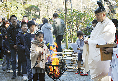昼間は働き、暗い夜に本を読み勉強をした二宮尊徳の教えを大切に毎年行われている。子どもたちは鉛筆や筆を順番に火の中に入れ、「元気に勉強ができますように」「字が上手になりますように」と、学業成就を祈願した。