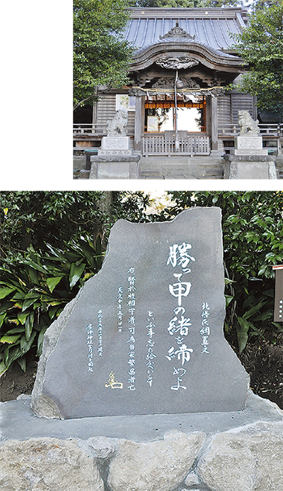 氏綱が他界する2カ月前、三代・氏康に残した遺訓『北条綱置文』の結びに書れている言葉が「勝って甲の緒を締めよ、を忘れ給ふべからず」。有名なこの格言は、同遺訓が初見とされている。同神社では神社創建の史実と氏綱への顕彰の意を込め、石碑を建立することにした。神社の氏子や近隣自治会、歴史愛好家たちに寄進を呼びかけ、奉賛金を集めた。