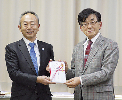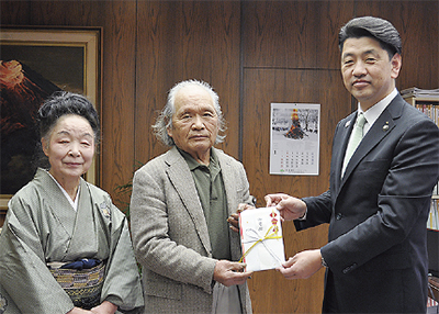 鈴木三郎さん、二三子さん夫妻が1月9日、昨秋の公開期間中に同園で募った41万4506円を市民ホール整備基金に寄付した。鈴木夫妻は「年々バスツアーの来場者が増えている。皆さんの気持ちを少しでも小田原のために役立てたい」と思いを込めた。