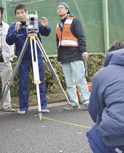 実習では実際の測量機器を用いて距離や角度を測り、指定場所に釘を打つ作業が行われた=写真。将来、測量関係の仕事を目指している井澤彩香さん(17)は「ミリ単位までより精密に測っていくのが難しかったが、楽しかった」と話した。