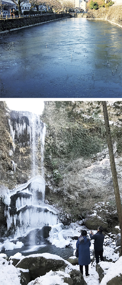 お堀も滝も凍る