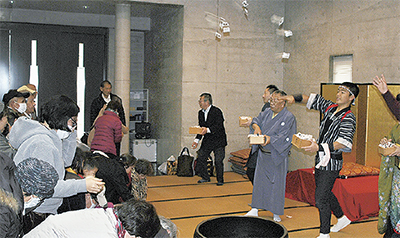 最後に「福は〜内」の掛け声に合わせて豆がまかれると、今年の無病息災を願い来場者は声を上げながら福豆を受け取っていた。