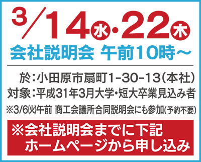 今年、創業105周年を迎える小田原ガス(株)が、2019年3月の大学・短大卒業見込み者を対象にした「会社説明会」を3月14日(水)・22日(木)に開催する。