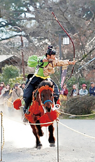 小田原城主北条氏康公が全国から手練の騎者を集め、腕くらべをしたとされたことを再現する。120mの走路に2つの的を置き、馬を走らせながら弓を射て順位を競う=写真。弓くらべの問い合わせは、日本和種馬文化研究協会【電話】0465・29・0830へ。