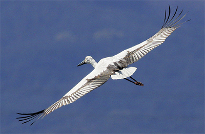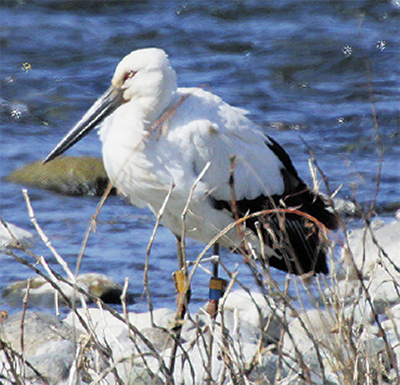 あしがら冬みず田んぼの会長で日本野鳥の会神奈川支部の伊豆川哲也さん(49)が、2月18日に酒匂川でコウノトリを撮影した。