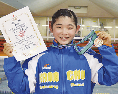 ジュニア最高峰の大会「全国JOCジュニアオリンピックカップ春季水泳競技大会」で、神奈中スイミング小田原に所属する石塚夕貴さん(酒匂小5年)が10歳以下50m背泳ぎで2位に入った。2度目のJOCで、初のメダルを獲得した。