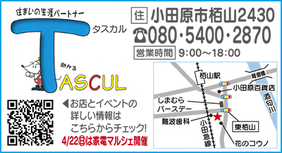 タスカルでは今日4月14日(土)、女性主催のガレージマルシェが行われる。時間は午前10時から午後3時。人気の地場野菜や食品、クラフト作品、フリーマーケットも充実の品揃え。毎月第2土曜日に実施しているので、出店希望者もぜひ訪れてみては。出店料は1ブース(2m×2m)500円。