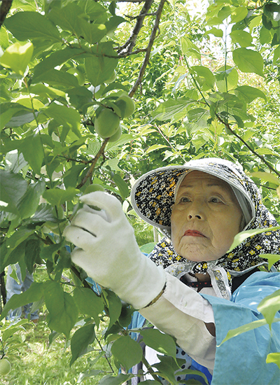 上曽我の瑞雲寺脇の梅林で5月16日、関東で一番早い「梅の初もぎ」が行われた。2Lサイズ(36〜39mm)の青梅50kgが収穫され、JAかながわ西湘成田総合選果場へサンプル出荷された。