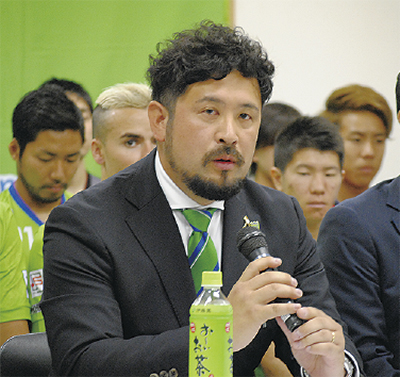 小田原市に本拠を置く湘南ベルマーレフットサルクラブが5月12日、Fリーグ2018/2019シーズンの開幕を前に新体制発表会見を開いた=写真。「昇動(しょうどう)」をスローガンに掲げ、クラブ史上最高成績を収めた昨季を上回るシーズンを目指す。