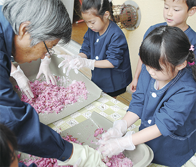 近所にある漬物会社の椎野食品工業所が同園へ八重桜を贈ったことを縁に3年前に始まったもので、椎野輝夫社長が指導にあたる。4月に梅酢と塩で漬け込み、今回は改めて塩を揉みこむ二次加工と呼ばれる作業。園児らは即興で作った歌を歌いながら、楽しそうに手を動かしていた。