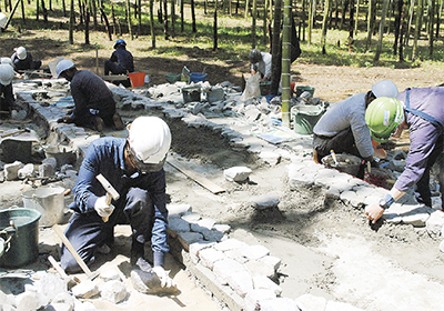 日本庭園協会神奈川県支部(清水哲也支部長)が4月20日から22日まで、久野の総世寺で石張り工事を行った。