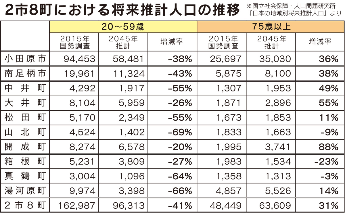 いわゆる“現役世代”とされる20歳から59歳の2045年の人口は小田原市で38%減少、県西地域全体で41%減少。現在は人口が増加している開成町では現役世代の減少が20%にとどまるが75歳以上の高齢者は約88%増加すると見込まれている。