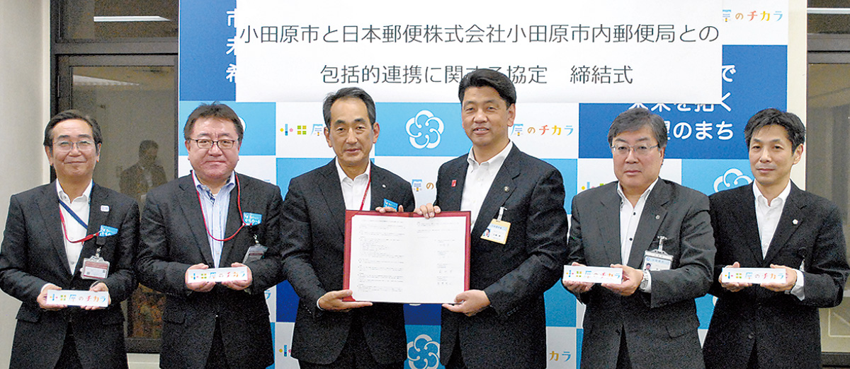 市と郵便局はこれまでにも災害時協力協定や道路損傷等の情報提供に関する覚書、広報小田原等の配架などの協力関係を構築。今回の締結は相互が有する人的・物的資源を有効活用し市民が安心して暮らせる地域社会づくりの実現が目的だ。