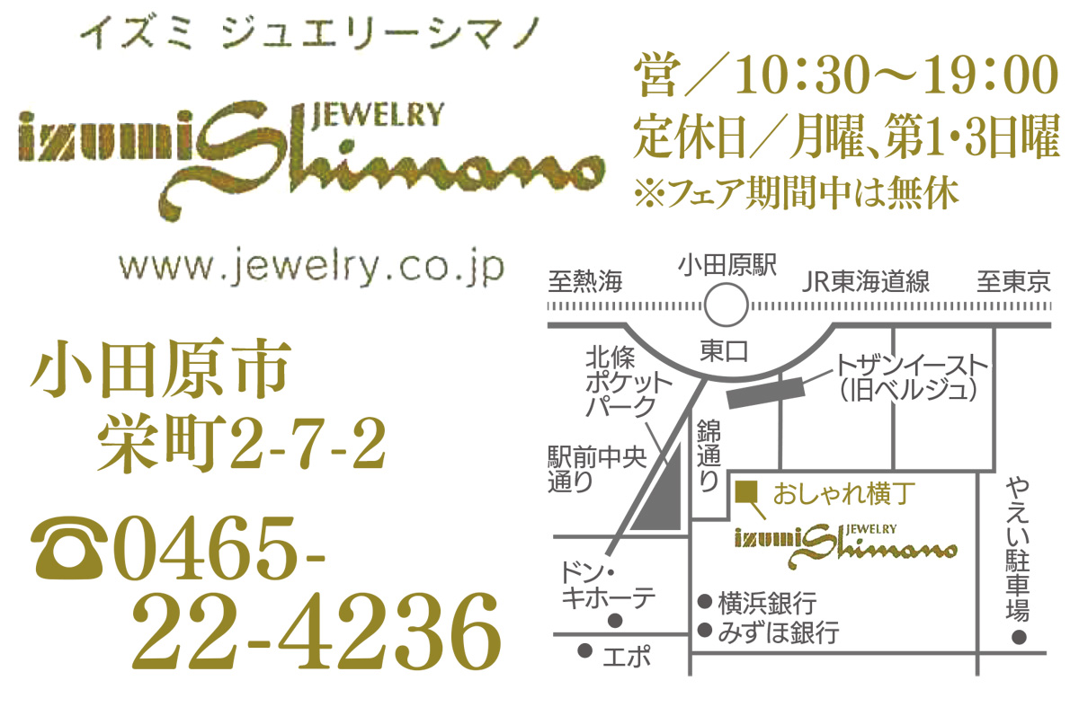 小田原駅東口の「izumiジュエリーシマノ」が6月10日に30周年を迎えた。代表の藤沢泉さんは「ずっと来てくださるお客様もいて、本当にありがたいです」と笑顔。同店では昨日から、お客様への感謝を込めた「30周年記念フェア」を6月24日(日)まで開催中だ。