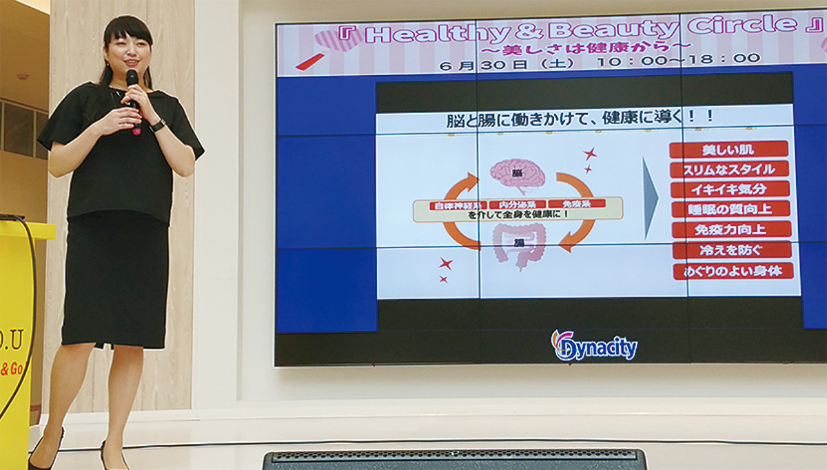 「美しさは健康から」と題し、アドバイザーが「脳腸相関」を軸に、健康な脳をかなえる栄養素や脳と腸に働きかける健康法などについてアドバイス。参加者に「腸が元気だと幸せホルモンが分泌されると言われています」と呼び掛け、腸内環境を整えることの大切さを説いた。来場した市内在住の20代女性は「大変勉強になった。今のうちから健康に気をつけていきたい」と語った。