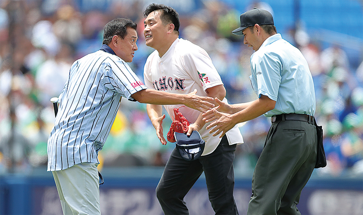 7月8日に横浜スタジアムで行われた開会式で表彰され、直後の開幕試合で球審を務めた。元中日の山本昌広さんと元巨人監督の原辰徳さんが投打を務めた始球式で「プレイボール」をかけると共に湯川さんの夏も幕を開けた。始球式後、「原さんと握手してリラックスできました」と笑い=右下写真、自身初の開幕試合の球審に臨んだ。