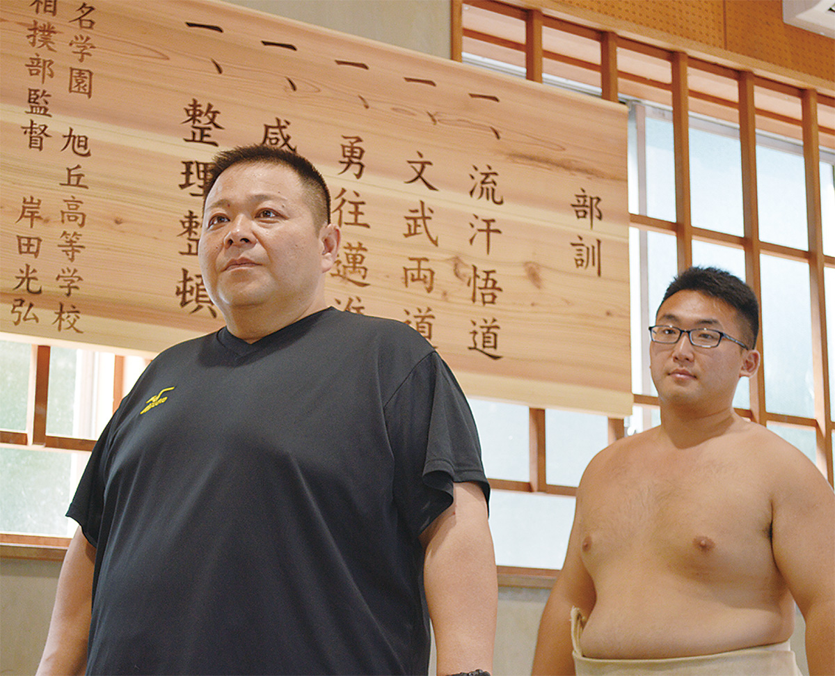 「気持ちがあるなら、絶対強くしてやる」。地域の相撲大会で出会った岸田監督に声を掛けられ、千葉醇也さんは旭丘高に入学。相撲同好会を2011年に立ち上げた。当時は相撲を取れる環境などなく、校舎の中庭に石灰で円を描いた即席土俵で稽古に励んだ。「稽古はきつかったが充実していた」。千葉さんは在学時代をこう振り返る。