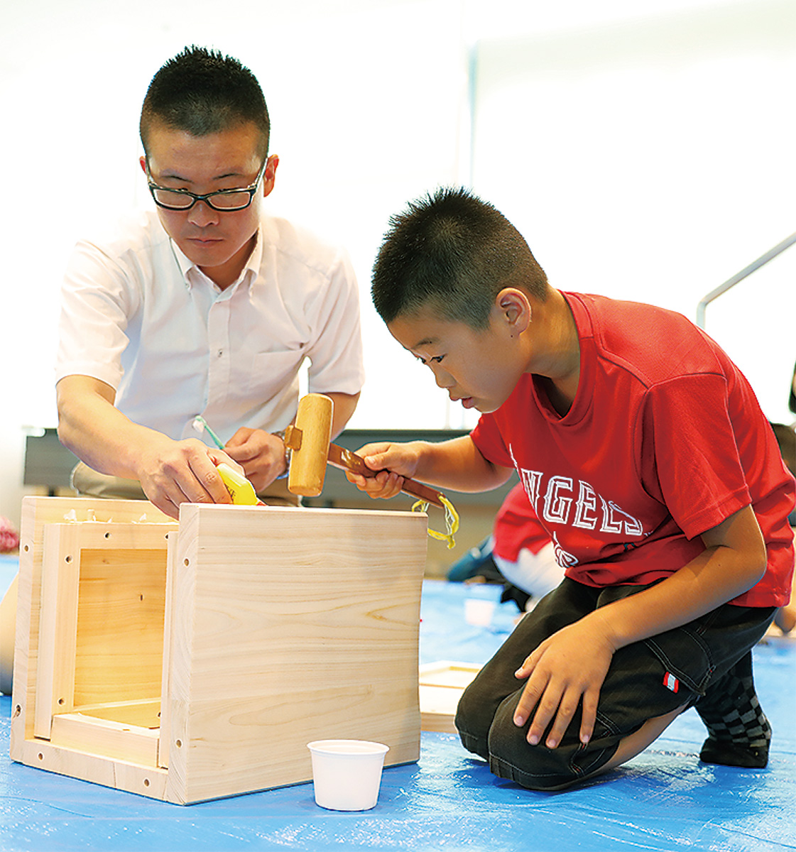 ラスカ小田原で7月28日、親子でいすづくり体験が行われ、14組の親子が参加した。