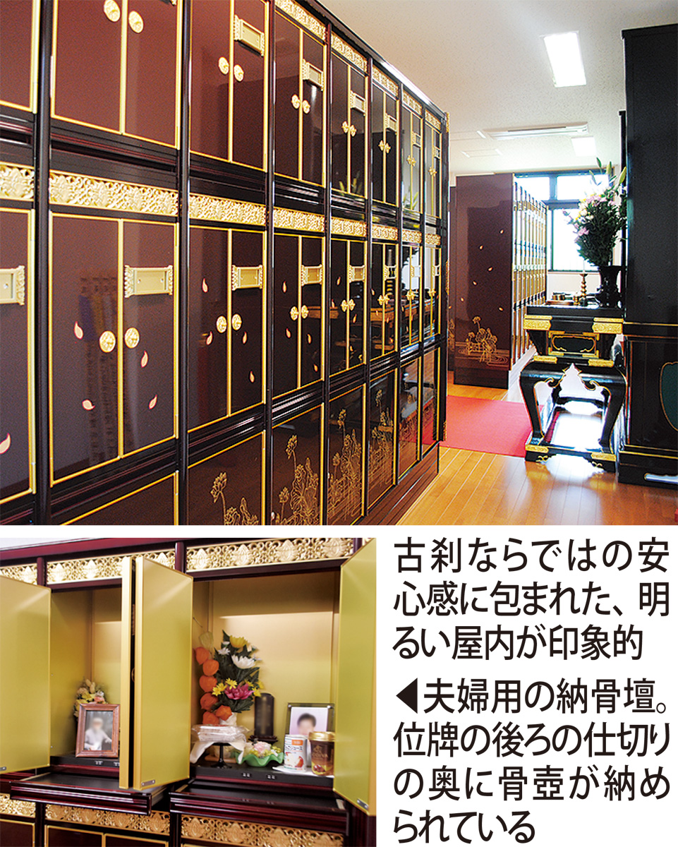 平安時代から弘法大師の教えを伝える古刹、飯田山福田寺に納骨堂が完成して3年半。各家・各人が各々の納骨壇をもつ小田原で初めての形式で、お墓と同じようにいつでも自分の家の納骨壇に礼拝供養ができる。個人用から夫婦用、家族用まで納骨壇の大きさは様々。特に夫婦用、家族用(4人)が人気で、夫婦用は第1期分32基が終了、第2期分18基の予約申し込みが9月1日(土)から始まる。