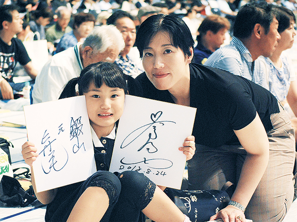 南足柄市の浜崎梨華さんは、長女の怜華ちゃん(向田小2年)と観戦に訪れた=上写真。親子そろって相撲好きで、今回のチケットも発売初日に購入。力士をより間近で見ようと花道に面した席を予約し、当日も開場前から小田原アリーナに駆けつけたという。「竜電が好き。顔がかっこいいから」という怜華ちゃん。色紙を何枚も持参し、錣山親方(元寺尾)らからサインをもらったほか「相撲絵師に似顔絵も描いてもらった」とにっこり。梨華さんは「真剣勝負の本場所と違って力士はリラックスモードなので稽古の合間に話もできる。びんづけ油の香りが漂うほどの距離感も嬉しい」と巡業ならではの魅力を話した。