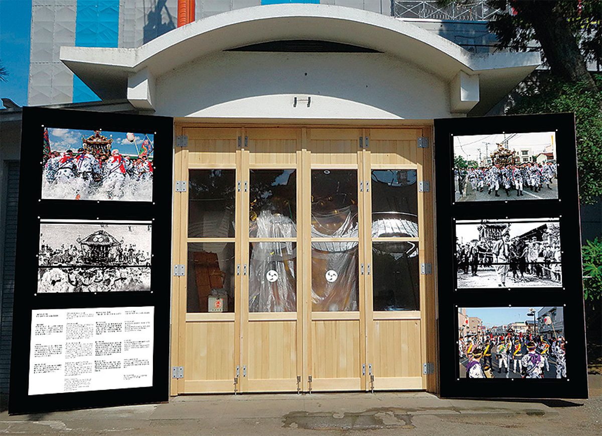 扉は神輿が見えるようにガラスの窓付きに。防火扉の内側には松原神社の歴史や神輿等の解説を日本語、英語、中国語、韓国語で表示する。村上道明宮司は「ありがたいこと。普段から一般の方に気軽に見に来てもらえたら」と話している。田代守孝委員長は「地域の魅力を磨き上げ見せていくことで、地元に愛着をもってもらえたら」と事業への思いを語る。