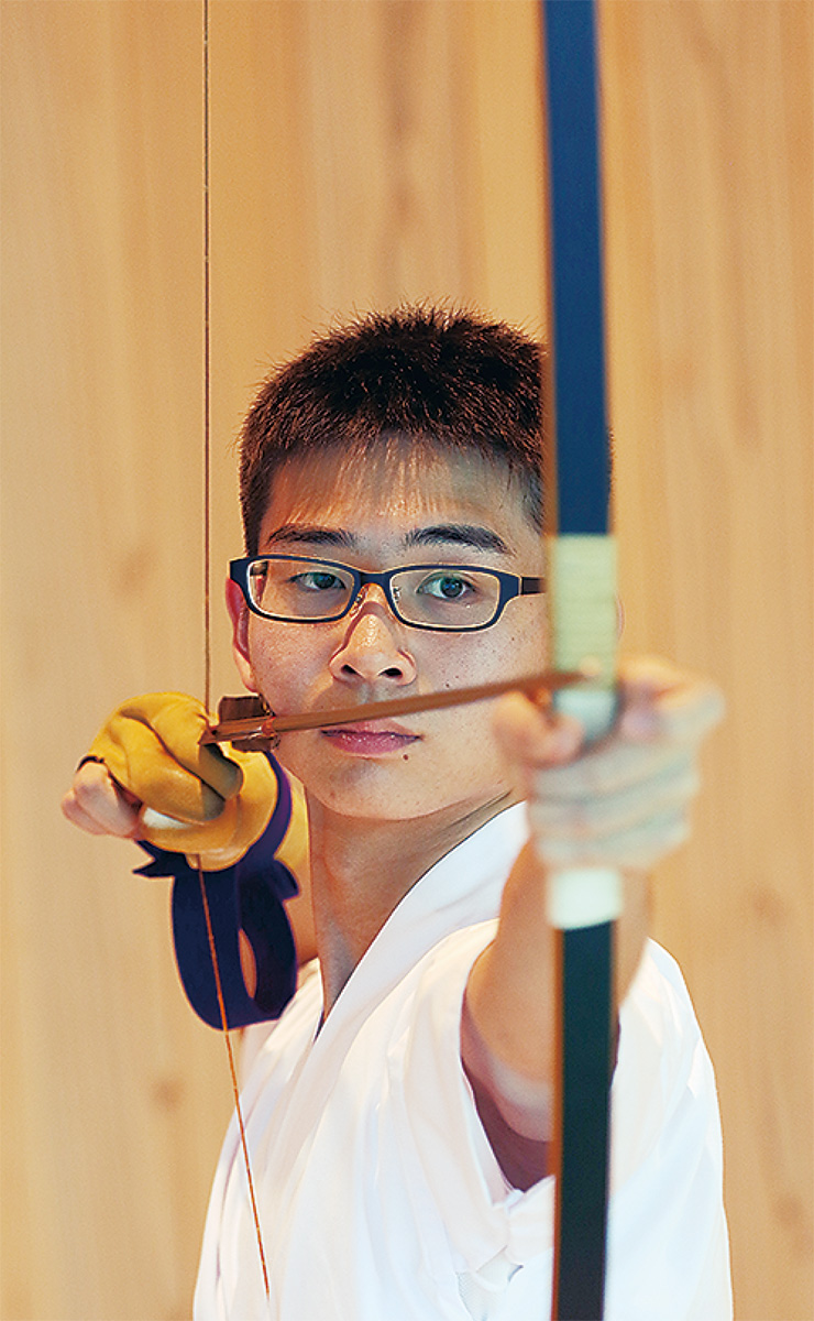 「緊張しました。関東に進めると決まった時はホッとして、うれしくて」と話す添田君。国府中学校(大磯町)時代の吹奏楽部から一転、高校から弓道を始めた。はじめは袴や射る立ち姿への憧憬で入部したが、観ると射るでは大違い。「きれいに弓を引くことすら難しい」と苦労を語る。
