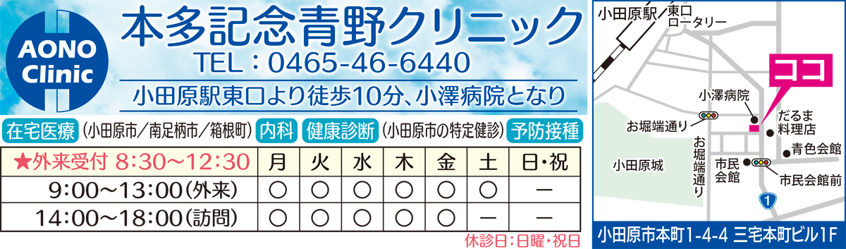 小田原駅東口徒歩10分、老舗だるま料理店向かい、小澤病院隣りに「本多記念青野クリニック」が開院した。間中病院で内科診療を担当してきた青野治朗院長が「患者様一人ひとりと、より近く向き合いたい」との思いで開いたクリニックだ。