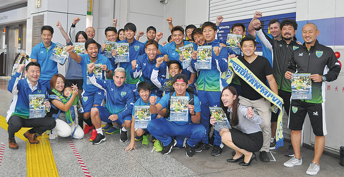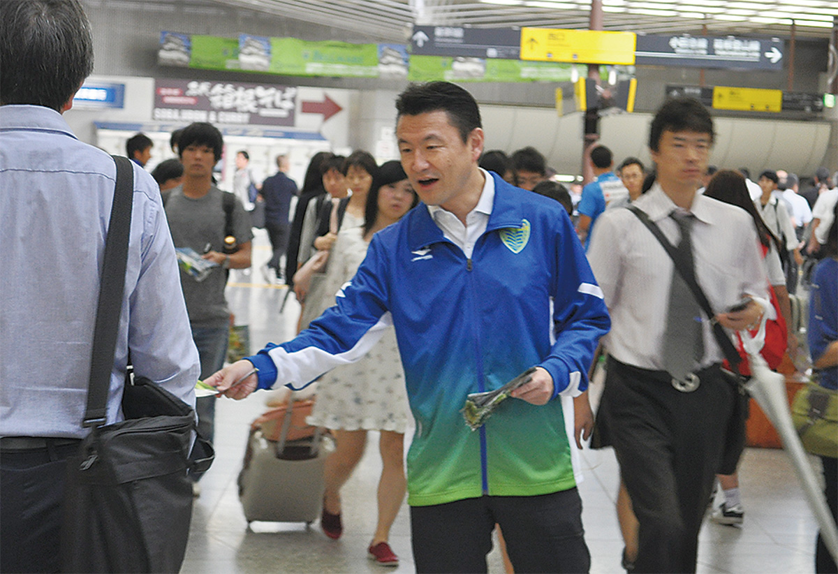 ホーム戦がある週の木曜日、朝7時半。通勤・通学で混み合う小田原駅の東西自由通路に立ち、元気よくあいさつをしながら試合告知のチラシを渡す。「自主的にチラシを配っている、ただのオジサン」と笑う大澤さんは、会社では事業部長。