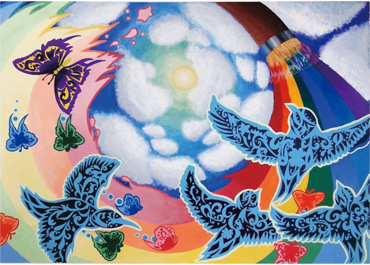 一方、「一目惚れした」という水色のセキセイインコを飼うほど「鳥が大好き」という岡本さんは「翔(はばたき)」をテーマにした制作に取りかかった。「私にぴったりのテーマだった」と話すように太陽や光、雲の中を鳥や蝶が舞い、七色の筆で導かれる姿を鮮明に描き、鳥と蝶には「見た人にしっかり存在感が伝わるように」と無数の点と模様を重ねて色を塗るこだわりも取り入れた。「思い描いたイメージ通りの作品に仕上がった」と満足気の岡本さん。最終候補13点の中から総合文化祭の開会式のパンフレットに採用された。