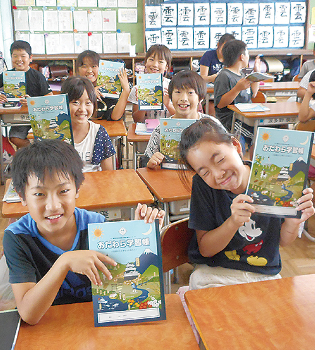 「おだわら学習帳」がこのほど、市内小学校の2〜4年の全児童に配布された。郷土の歴史や文化、産業などの解説が合間に織り込まれたノートで、配布は昨年に続き2回目。小学校1年生と公立幼稚園、一部の私立幼稚園の4歳児には、二宮金次郎が表紙の「おだわらぬりえ」が配られた。