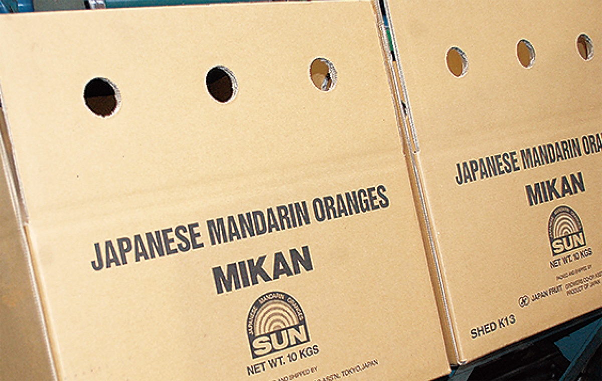 「MIKAN」の文字が印刷されている段ボールで出荷したみかんの輸送は船便で、到着までの期間は2〜3週間。早く熟しているものは途中で傷みやすいため、皮に青味が残り、ある程度酸味があるものが適している。輸送中に徐々に熟して甘みが増し、カナダの店頭に並ぶ頃に食べごろになるという。
