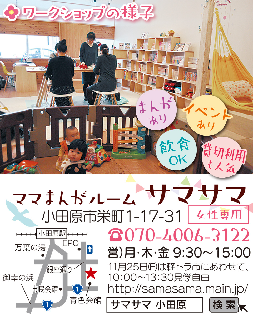 小さなお子さんと一緒に気兼ねなくくつろぎに行ける、銀座通りの「ママまんがルーム サマサマ」。棚には漫画が500冊、絵本も充実している。飲食の持ち込みも宅配も自由なので、最近では女子会も人気なのだとか。利用は1時間600円、最大1200円、未就学児は無料。