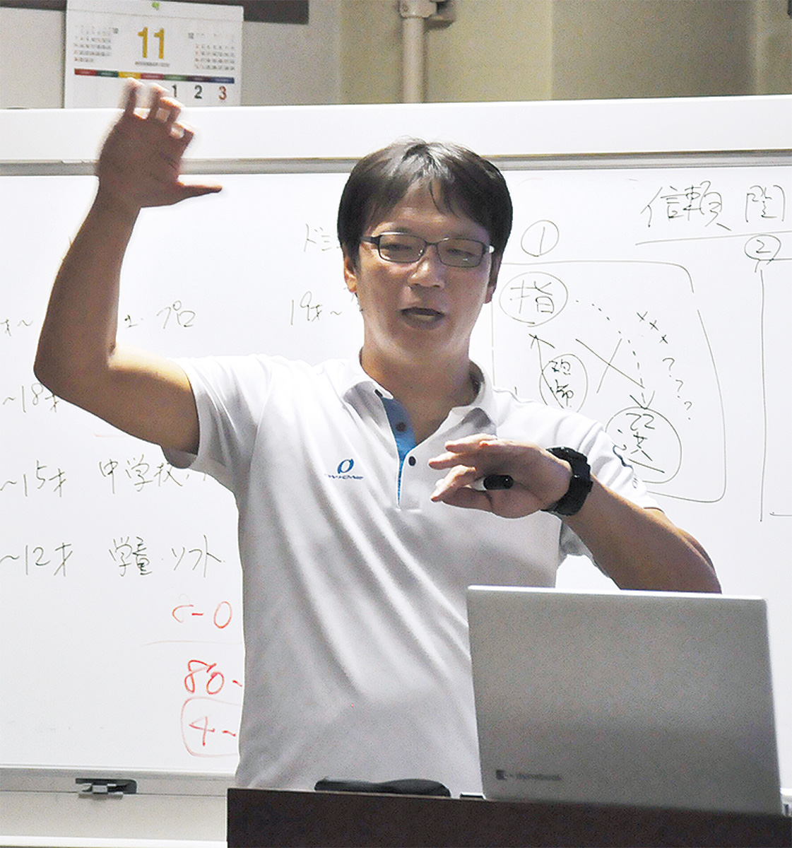 ラテンアメリカ野球から学ぶ、選手指導・育成研修会が11月11日、県立体育センターで行われ、今年3月に続いてNPO法人BBフューチャー・プロスペクト(株)の阪長友仁さんが講演を行い、県西地区の野球チームの監督、コーチら17人が参加した。南鴨宮のイトウスポーツ主催。