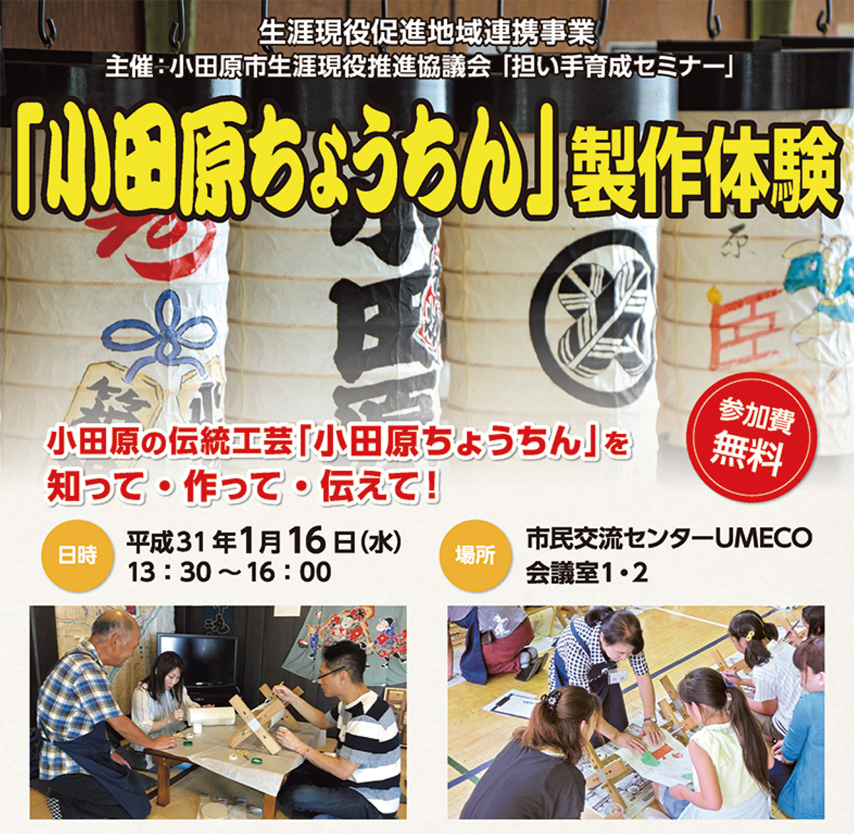 シニア世代を対象にした小田原ちょうちんの製作工程を学ぶ無料セミナーが平成31年1月16日(水)に市民交流センターUMECOの会議室1・2で開催される。午後1時30分〜4時。このセミナーは、シニア世代が持つ経験や知識を活かし、セカンドライフへ向けた準備を手助けする小田原市生涯現役推進協議会が主催している。
