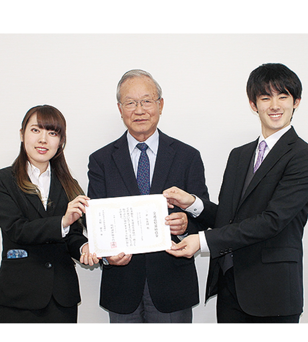 10月27日に実施した学院祭の純益金5万円を交通遺児援護基金に寄付。学生代表の安部陽風さん(19)と松本宙也さん(18)が市社会福祉協議会の小野康夫会長に目録を手渡した。安部さんは「子どもたちのために役立ててほしい」と話した。