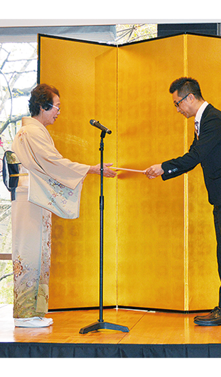 12月9日に開催した免許認定式の中で市ふるさと文化基金へ5万円を寄付。小田原講師会会長の下田豊乃婦さんが目録を手渡した。小田原に本部を置く着付けスクールで、若山武司代表は「文化活動に役立てて」と話した。