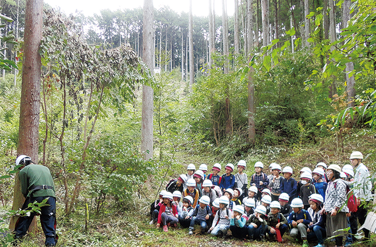 2016年に始まった事業は、林業の基礎を学ぶ「座学」、森林・製材所・加工工場などを見て回る「校外学習」、そして木製品を生活の一部に取り入れる「木製品導入」の3本立てから成る。木がたどる一連の過程を通年で学ぶことで、間伐の重要性への理解を深め「人の手が入り、木を使うことで、森林を守る」というつながりを肌で感じてもらうことが狙いだ。