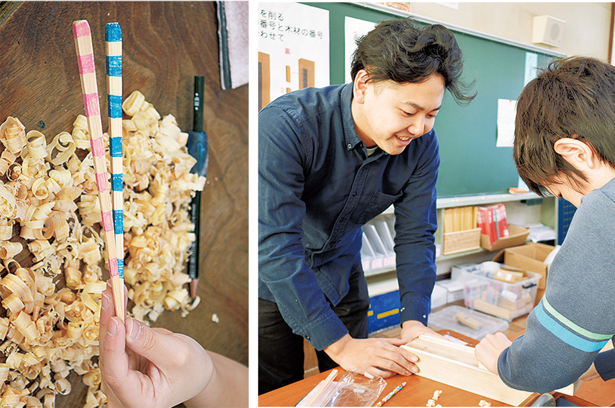 削り出したヒノキの木屑が教室に溢れかえる。国府津小で昨年11月に実施された木工教室の一幕だ。間伐材を使ってオリジナル箸を制作する授業で、この日は木工製品を製造する薗部産業が講師を務め、道具の説明や木の特性の話を交えながら、技術指導にあたった。