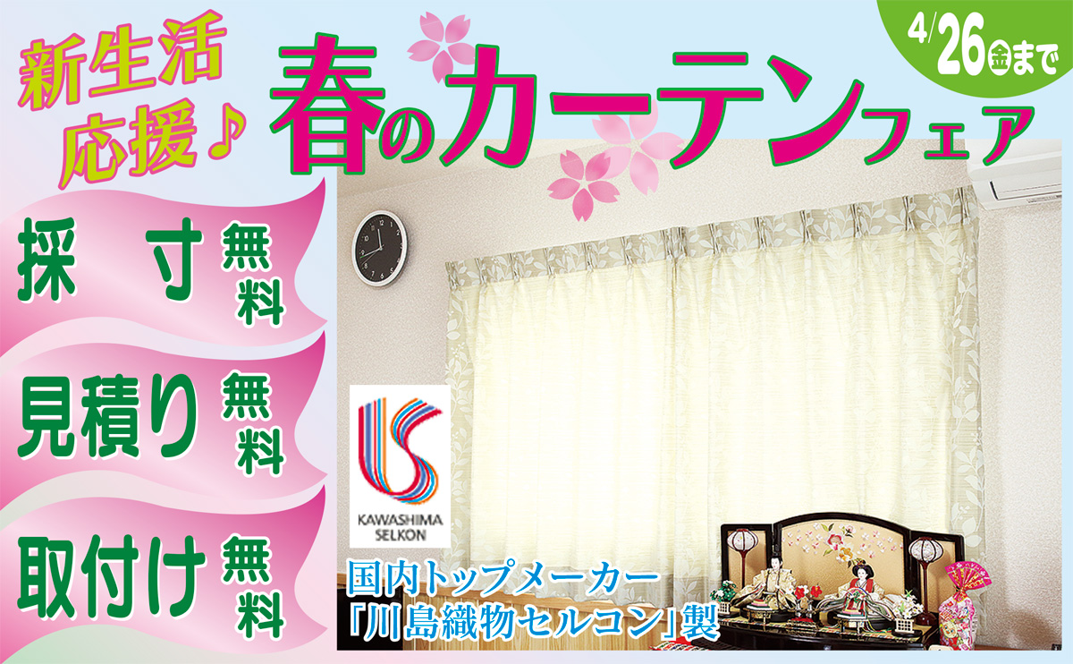 トップメーカー「川島織物セルコン」の高品質カーテンを量販店並み特別価格で提供。さらに初回の採寸・見積り・取付けも無料サービス。この春、新生活を始める人にもおすすめ。4月26日(金)までの期間限定、お気軽にお電話を。
