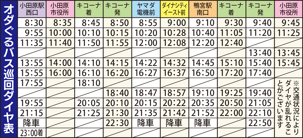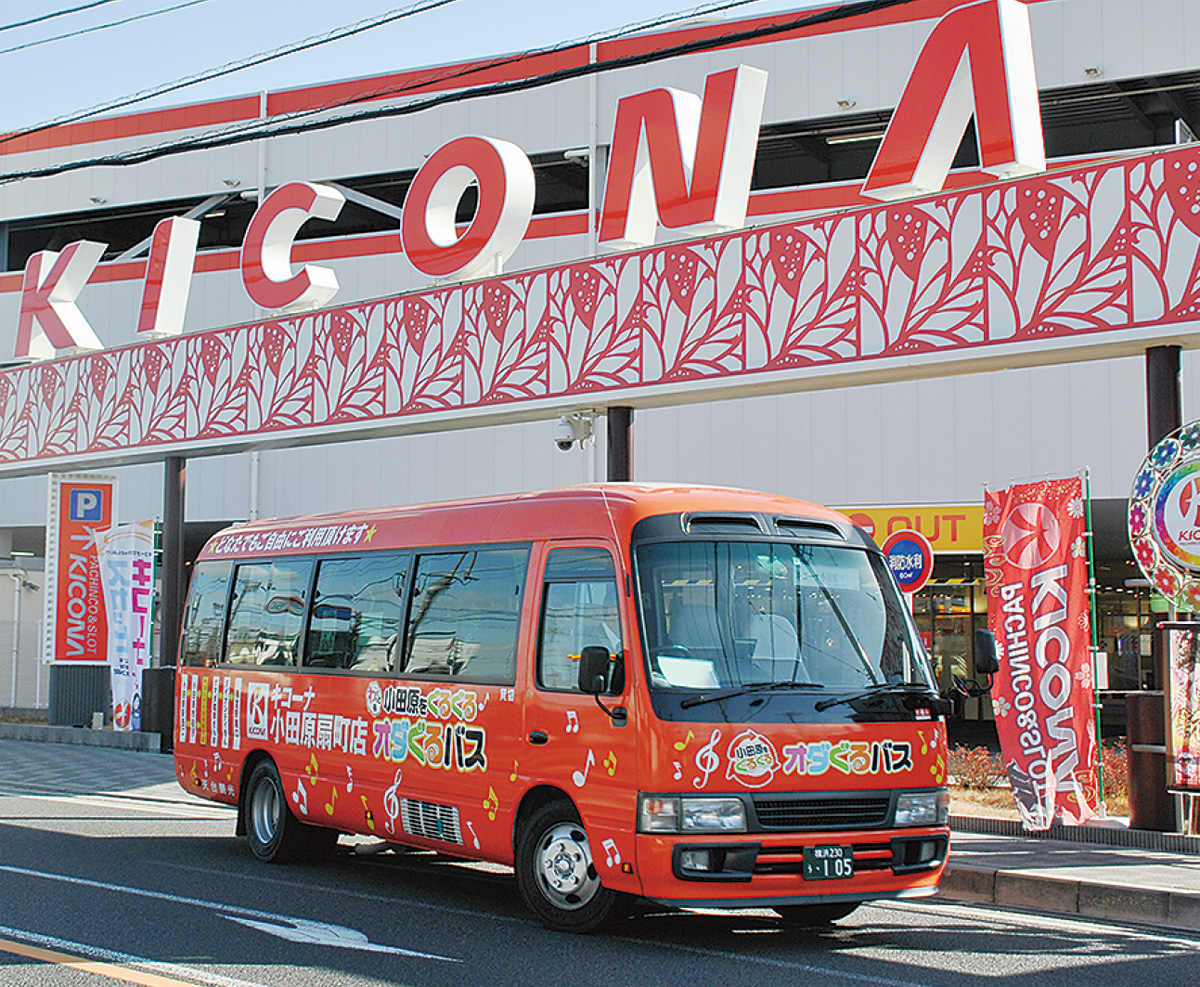 パチンコ&スロットの「キコーナ小田原扇町店」が運行する「オダぐるバス」が、駅利用や買い物に便利と喜ばれている。誰でも乗れる無料の小田原巡回バスで、飯泉橋西側の同店を中心に小田原駅西口、市役所、巡礼街道のヤマダ電機、ダイナシティイースト、鴨宮駅南口を結ぶ。