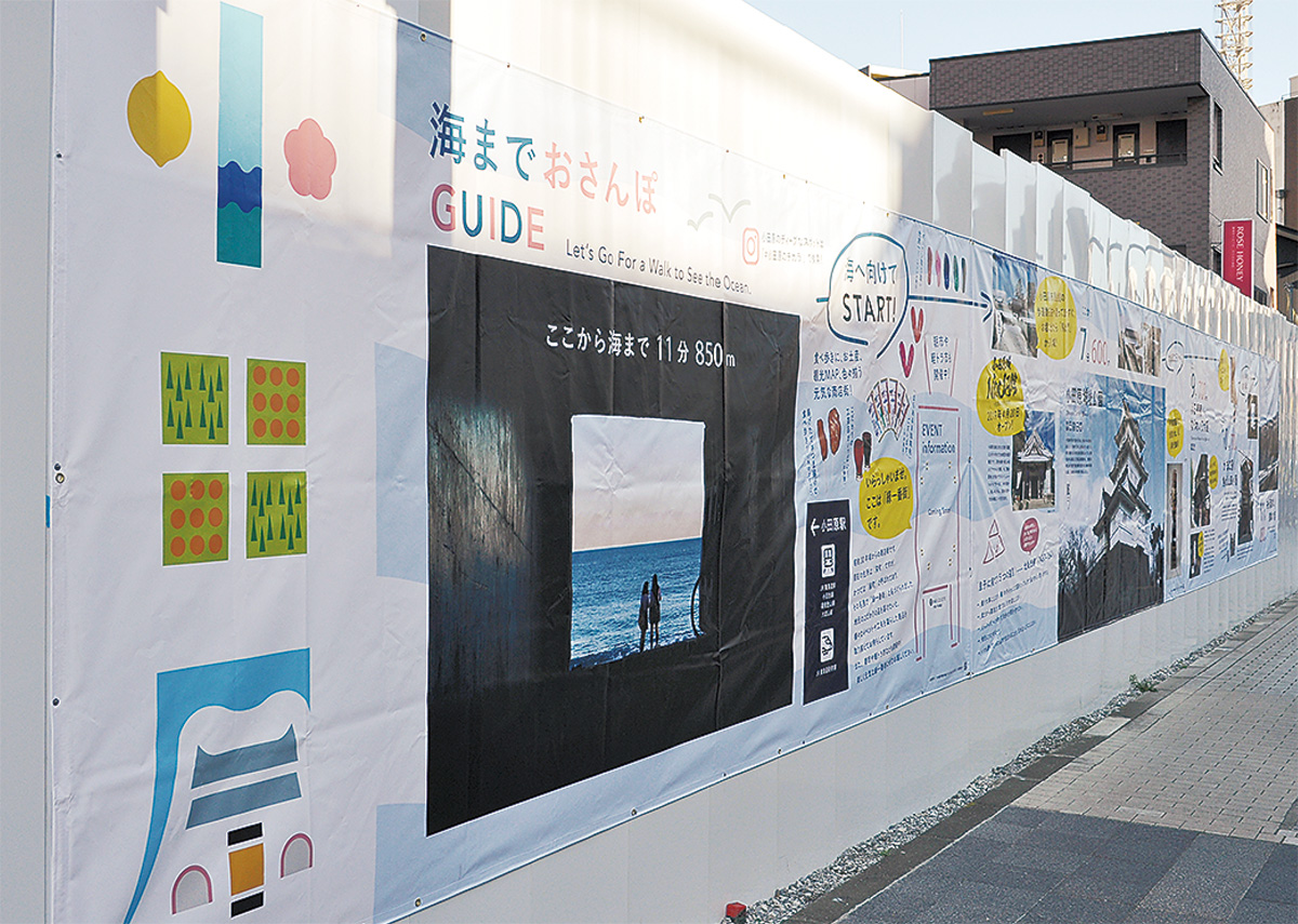 3月8日に登場した横断幕には、「海までおさんぽガイド」と題し、現在地の緑一番街から城址公園や小田原宿なりわい交流館、かまぼこ通り、そしてゴールの御幸の浜海岸までの距離や時間などがデザインされている。