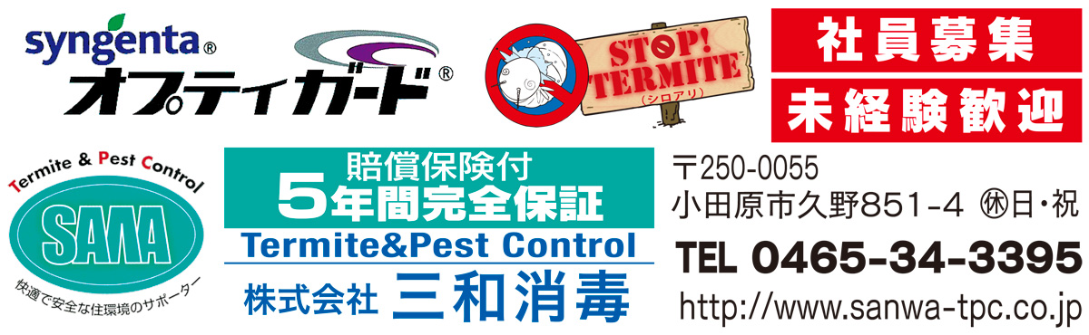 毎年羽アリが出る。最近床がブカブカする。こんな症状はないだろうか。ひょっとして、シロアリという住まいの病かも?木材の繊維質を分解して土に返すシロアリ。見えないところで私たちの大切な住まいが蝕まれ、何時しか倒壊なんて事に…。そんな不安を解消してくれるのが床下のスペシャリスト(株)三和消毒だ。しろあり防除士の有資格者による豊富な経験と熟練の技術力だから任せられる。また、安全性の高い認定薬剤を厳選して使用し、施工後は5年間の保証付きだ。
