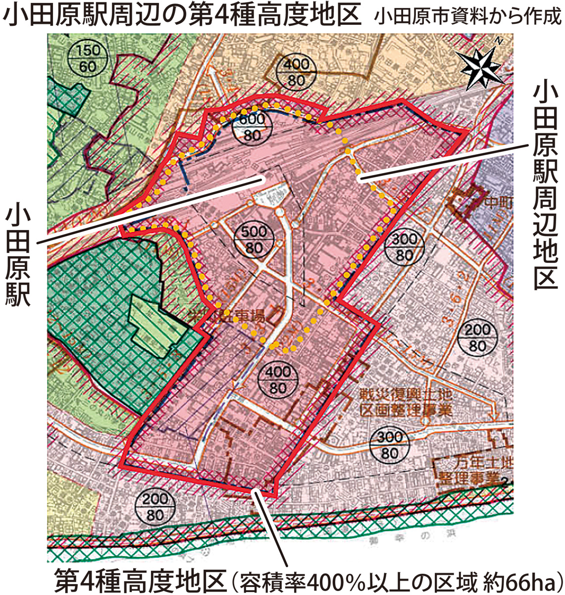 小田原市は、小田原駅周辺の第4種高度地区に設定している建築物の高さ制限「高度地区」の都市計画を見直し、緩和に向け準備を進めている。