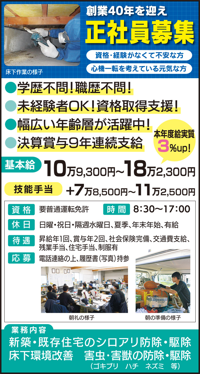 同社はシロアリ防除・駆除を主に、床下環境改善やゴキブリ、ハチ、ネズミなどの防除・駆除を行うプロ集団。地域の信頼を得て成長を続け、9年連続で決算賞与を支給している優良企業だ。