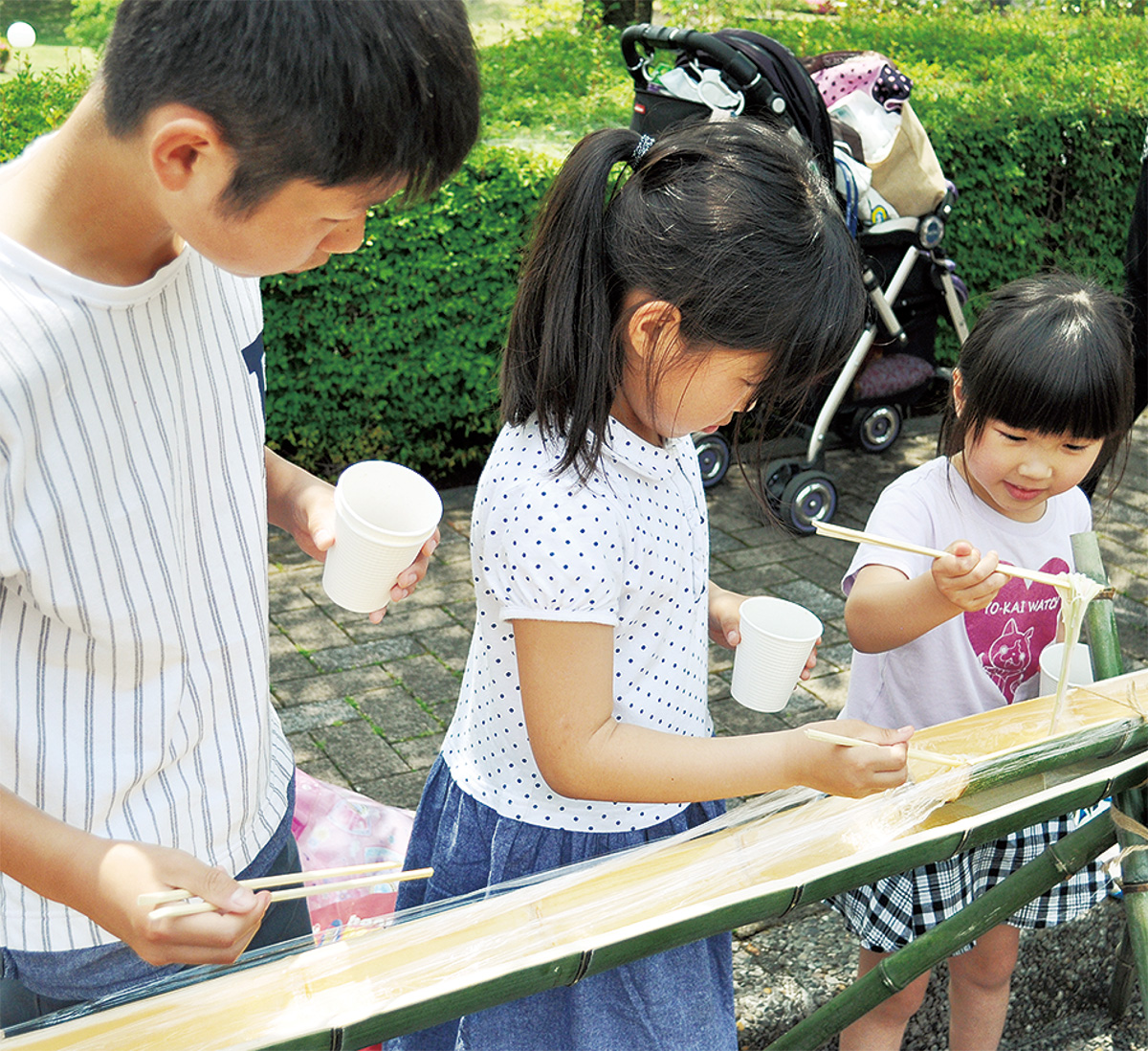 市内から家族4人で訪れ、流しそうめんを体験した金子大吾くんは「みんなで食べたそうめんは美味しかった。この後のプールも楽しみ」と笑顔で話した。