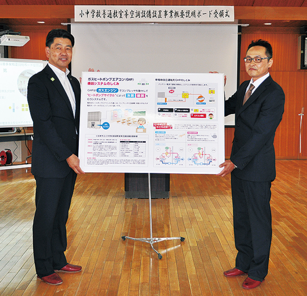 今回設置されたのは停電時電源自立型GHPと呼ばれるガス式の設備で、停電時もバッテリー電源で稼働可能なもの。企業体では、こうした設備の仕組みと地元業者が一丸となった事業を子どもたちに知ってもらおうと図解入りの説明ボードを作成し、全校に寄贈した。